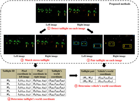 In this section, three proposed methods, including taillight detection, stereo taillight matching, and taillight pairing are respectively presented in Section 3.1–Section 3.3.