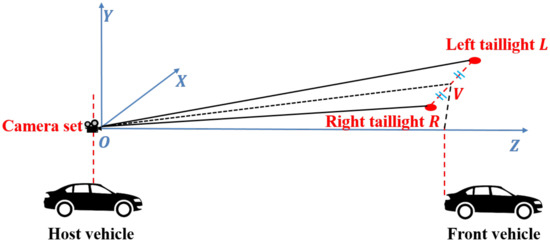 In stage (5), we suppose that V is the midpoint of the line segment that connects the left taillight L and right taillight R of the vehicle. The world coordinates of V can be considered as the position of the vehicle, as illustrated in Figure 3.