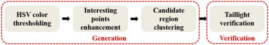 In the V2V positioning context, the taillight detection stage aims to obtain the pixel coordinates of each taillight in the image. Moreover, the regions of these taillights need to be preserved because they will be further used in stereo taillight matching and taillight pairing stages. To accomplish these requirements, we propose a taillight detection method that includes two phases: generation and verification. The generation phase is to generate the candidate taillight region from the image. This phase comprises of three steps: HSV color thresholding, interesting point enhancement, and candidate region clustering. The verification phase, which consists of one step that is taillight verification, is to verify whether each candidate region is a taillight or not. The verification phase is an additional phase when compared with many existing detection methods [12,13,15,16,17]. It should be noted that sometimes when taillights from different vehicles approach each other, taillight occlusion occasionally occur under the camera’s viewpoint. To resolve this phenomenon completely, complicated research is required, which is beyond the scope of our study. Therefore, in this paper, we only focus on taillights that are already separated from each other in the image. Accordingly, we assume that each interesting point that is adjacent to another belongs to the same taillight. Figure 4 below shows the entire flow of the proposed taillight detection method. The details of each step are provided in the remaining part of this subsection.