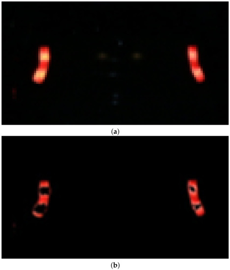 As mentioned in Section 1, the existing stereo matching approaches have a limitation on computational complexity. In our proposed stereo matching method, we are only concerned about determining the one-to-one correspondence of the interesting objects, which are taillight regions, whereas the remaining part of the image is ignored, as illustrated in Figure 12. Compared to existing studies [21,22,23,24], it significantly reduces the computational complexity, which is mandatory for real-time applications.