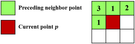 In this step, a candidate region clustering algorithm derived from the connected-component analysis method [29] is introduced for determining the region and pixel coordinates of each candidate taillight. To achieve this target, our idea is labeling each interesting point based on its preceding neighbor, beginning from the first point in the image. All points that have the same label are put into one list, which represents one candidate taillight region. The preceding neighbor of a point p(x, y) is defined as any interesting point that has one of the following pixel coordinates: (, ), (, y), (, ), or (x, ). If p has at least one preceding neighbor point, a point q, which has the minimum label among all preceding neighbors of p, is picked, as illustrated in Figure 7. The point p is assigned into the region of q, and the region of each remaining preceding neighbor of p is also merged into q’s region. Otherwise, p is assigned to a new region with a new label. The details of this algorithm are provided as Algorithm 1.