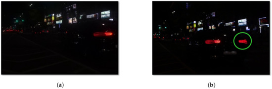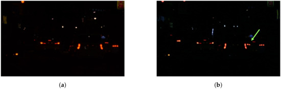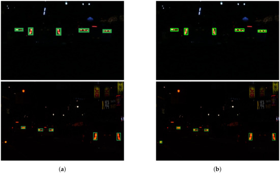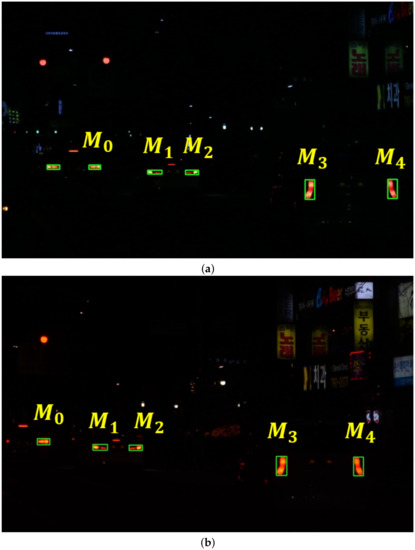 The number of correctly detected taillights is indicated by , the number of falsely detected taillights is indicated by , and that of the missed taillights is indicated by . They respectively play a role of , , and in Equations (35) and (36). We evaluate the performance of the proposed taillight detection method in Table 4.