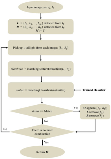The procedure of the proposed stereo taillight matching method on each image pair (, ) is explained as follows. Iteratively, each taillight combination (, ) will be considered. At first, the function matchingFeatureExtraction is applied to the combination (, ) to extract the feature vector , which is further fed into a pre-trained matchingClassifier. This classifier returns a with two possible values of match and not match, which represent whether and match each other. If they are predicted as matched, (, ) will be added to . Additionally, will be removed from L and will be removed from R. The procedure then continues considering another combination until there are no more possible combinations remaining from and . The entire flow of this procedure is described in Figure 15.