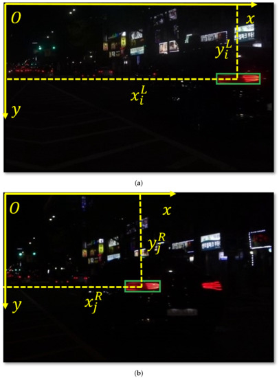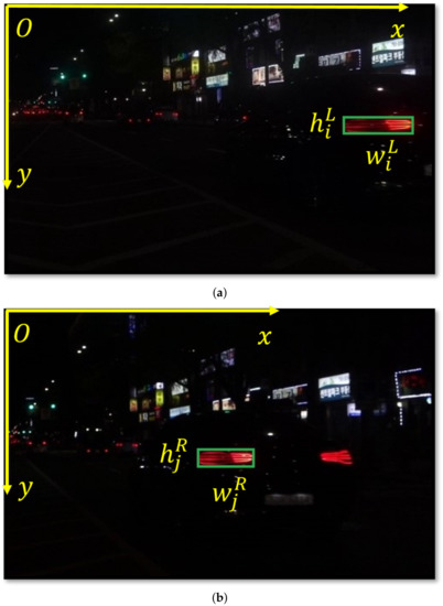 - HPR: Implies the horizontal coordinates difference between the two taillights and .Let us assume the horizontal coordinates of and as and , respectively. Initially, both and are normalized as and by dividing with the width of the corresponding image, which is and :After obtaining and , HPR is determined asThe value of HPR lies within the range [−1, 1]. The negative value implies that the horizontal coordinates of are smaller than those of , and vice versa. As illustrated in Figure 2, the horizontal coordinates (Ox-axis coordinate) of the object in the left image must be larger than those in the right image; therefore, the HPR of the two matched taillights must be greater than 0. Otherwise, we can conclude that the two taillights do not match each other.