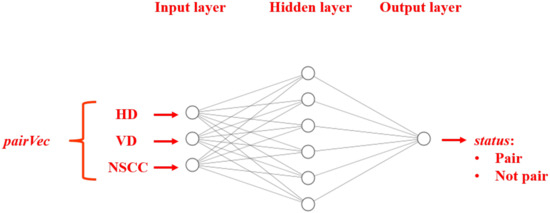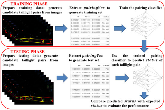 PairingClassifier needs to be trained to determine suitable values for W, b, and . A training set includes the feature vector and the expected status of multiple taillight pairs. During training, a backpropagation algorithm [35] is applied to adjust these three parameters until a certain minimal loss is reached. The loss represents the difference between the predicted status and the expected status. In this study, a binary cross-entropy loss function was chosen to calculate the loss value, whereas an Adam algorithm was used as the optimizer function. In conclusion, all relevant parameters for training pairingClassifier were set up as shown in Table 2.