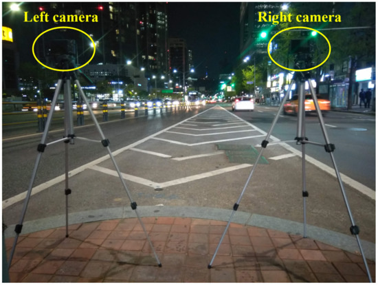 We set up an experiment in the nighttime traffic scenario, as shown in Figure 24. Two cameras, which were called left and right cameras, were kept static on a fixed height with a fixed horizontal inter-distance to capture front vehicles moving along the four-lane road. The model of both cameras used was a Sony Cybershot DSC-RX100, with a CMOS image sensor. Besides, these cameras were configured to maintain sufficient details of the candidate taillight regions in the images.