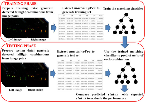 The remainder of this subsection is organized as follows. In Section 3.2.1, we introduce a procedure for matching the taillights in the left and the right images. In Section 3.2.2, a list of relevant features to the matching procedure is explained. Additionally, the stereo taillight matching classifier based on the gradient boosted tree is proposed in Section 3.2.3.