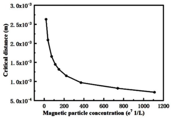 The above theoretical analysis mainly focuses on the force acting on a single magnetic particle in two states: (i) the motion analysis of the magnetic particle suspended in the liquid, but not contacting the object surface under the action of the magnetic field; and (ii) the motion analysis of the magnetic particle just falling on the object under the action of the magnetic field. Assuming that magnetic particles are uniformly distributed in the suspension, the “critical distance” obtained by the model theoretically determines the optimal magnetic particle concentration in the suspension. Equation (24) was derived in MATLAB, and all constant values such as particle diameter, magnetic field intensity, particle density, liquid density, and defect size were directly substituted into the above Equation (24) to obtain the final limit distance.