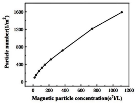 Figure 6 shows the effects of magnetic particle concentrations on the “critical distance” for magnetic particle accumulation. With the increase of the magnetic particle concentration, the critical distance dropped sharply and then decreased slowly. The reason for this phenomenon is that after the magnetic particles are magnetized, the magnetic field direction of the particles themselves does not completely match the leakage magnetic field formed by the simple defects on the particles around them, consequently they may be partially neutralized by each other. Therefore, as the particle concentration increases, the adsorption limit distance will decrease.