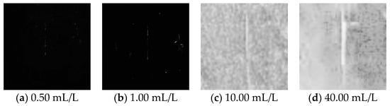 In order to systematically investigate how different magnetic particle concentrations in the suspension influence on the captured images, the magnetic particle suspension was prepared at both higher and lower concentrations than the recommended one by the MPI international standards ISO 9934, so as to determine the optimal magnetic particle concentration range [24]. Magnetic particle suspensions with the concentrations of 0.50 mL/L, 1.00 mL/L, 10.00 mL/L, and 40.00 mL/L were used as the test samples. According to the standard and practical experience, the general magnetic powder concentration is usually 3–6 mL/L. In this study, the concentration is far beyond the standard stipulated concentration. The workpiece magnetic field strength was 2400 A/m. The corresponding magnetic particle indication images captured by a high-resolution CCD are displayed in Figure 9.