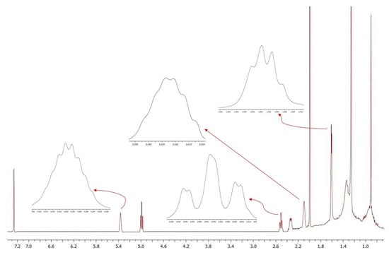 Hydrodistillation of A. secundiramea Biv. subsp. secundiramea leaves (L) gave a pale-yellow oil, (yield (0.46%). Only four components were recognized, representing 99.2% of the total composition. The metabolites are listed in Table 1 according to their retention indices on an HP-5MS column. All the four compounds were chrysantenyl derivatives with (E)-chrysanthenyl acetate (Figure 1) (91.5%) as main compounds, followed by chrysanthenone (4.2%), (E)-chrysanthenol (3.3%), and a small amount of (Z)-chrysanthenol (0.2%). Quite amazingly, hydrodistillation of A. secundiramea Biv. subsp. secundiramea flowers (F) gave an oil (yield 1.55%) containing only (E)-chrysanthenyl acetate (100.0%). The positive optical rotation of the oil determined its absolute configuration as (+)-(E)-chrysanthenyl acetate, whose synthesis starting from (+)-verbenone has been previously described []. The chromatograms of the two oils (L and F) are reported in Figure 2, whereas Figure 3 shows the 1H-NMR spectrum of the oil from flowers.