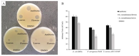 The presence of antimicrobial molecules in the essential oil extracted from A. secundiramea leaves and flowers was detected using Kirby-Bauer assay [,] against Escherichia coli DH5α, P. aeruginosa PAOI, or S. aureus ATCC 6538P strains.
