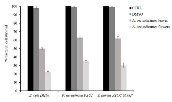 Antibacterial activity of A. secundiramea essential oils from flowers and leaves, evaluated by colony count assay, against E. coli DH5α, P. aeruginosa PAOI, and S. aureus ATCC 6538P at a fixed concentration of 500 μg/mL. Untreated cells represented control because negative controls are bacterial cells with dimethyl sulfoxide (DMSO 2%). Each bar is the average of three different experiments. p value is <0.05.
