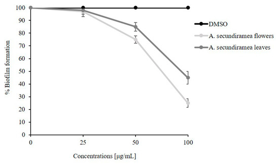 Biofilm formation is a quorum-sensing regulated differentiation system used by different bacteria on plant surfaces [], but also in the human body environment, as a protection against other microorganisms and antibacterial substances []. To study the leaf and flower oil effect on bacterial biofilm formation, we used P. aeruginosa PAOI, a biofilm producer, as the indicator strain. Bacterial cells were grown with and without the addition of leaf and flower oil at different concentrations (25, 50, and 100 μg/mL), not inhibiting the planktonic growth. As shown in Figure 6, a progressive increase of A. secundiramea oil concentration corresponds to a decrease of biofilm formation. In particular, 100 μg/mL of flowers extract oil inhibited the biofilm formation for about 65%. To exclude any antimicrobial effect on planktonic growth, we followed the bacterial growth curve with and without both extracts at maximum concentration, used in the previous experiment. In this condition, PAOI growth rate did not change when compared to the untreated cells (data not shown). Biofilm formation of microorganisms causes persistent tissue and foreign body infections resistant to treatment with antimicrobial agents, such as Staphylococcus epidermidis, P. aeruginosa, S. aureus, and E. coli []. Our oil, containing a single compound that possesses antibiofilm activity, represents an important resource to counteract the biofilm formation.