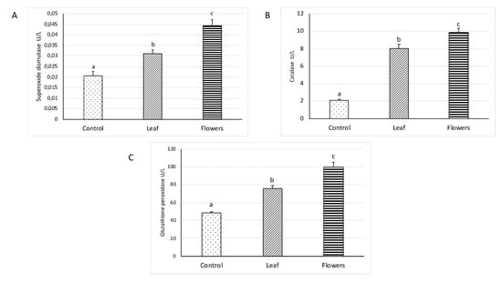 Effect of leaf and flowers essential oil extracts of A. secundiramea on activities of antioxidant enzymes in polymorphonuclear cells. (A) Superoxide dismutase; (B) catalase; (C) glutathione peroxidase. Data are presented as mean and standard error, and were analyzed with the paired t-test. * p < 0.001.