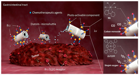 The ability of carriers to reduce the drug release rate and control drug diffusion to cells is a critical point that can be addressed by engineering the surface of the carriers. The porous ultrastructure of the frustule can be coated with polymers preventing the burst release of the therapeutic molecule. These coated frustule elements can then find applications in site-specific delivery of drugs. Recently, drug selectivity and targeted drug delivery have been reported to decrease undesirable side effects to healthy cells and reduce patient suffering. Delasoie et al. [45] described an innovative colon-focused drug delivery system (CFDD) based on the functionalization of diatom frustules (DEM) with vitamin B12 (DEM-B12), which binds the transcobalamin (II) receptor (TC II) overexpressed on cancer cells. Additionally, the DEM-B12 surface was modified with either porphyrin as photosensitizer elements or the 2,2′-bipyridine-3,4-dicarboxyilic acid manganese tricarbonyl compound as a photo-triggered CO-releasing molecule (Figure 2).