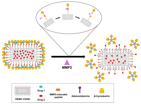 Figure 3. Schematic proof-of-concept of the self-assembled carrier for dual-delivery: the drug release from the core and corona of the functionalized diatom microparticles starts after the cleaving of matrix metalloproteinases-2 (MMP-2) specific peptides in the presence of MMP-2 enzyme. Reproduced from Reference [53], copyright (2020), with permission from Elsevier.
