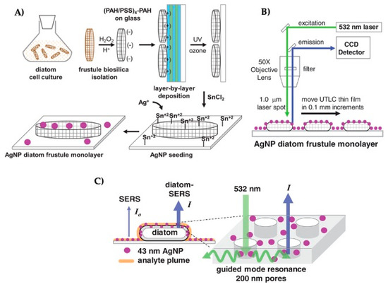 Figure 4. (A) Fabrication of the AgNPs–diatom frustule biosilica monolayer on glass. (B) Configuration of micro-Raman laser for scanning ultra-thin layer chromatography film embedded with diatom for surface enhancement Raman scattering (SERS). (C) Schematic representation of SERS signal intensity of separated analyte plume around AgNPs–diatom frustule monolayer versus AgNPs on the glass, illustrating the guided-mode resonance effect. Reproduced and adapted from Reference [75], copyright (2020), with permission from John Wiley and Sons.