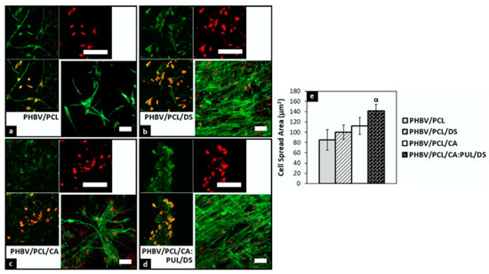 Figure 5. Laser scanning confocal microscopy images of Saos-2 cells on PHBV/PCL (a), PHBV/PCL/DS (b), PHBV/PCL/CA (c), and PHBV/PCL/CA: PUL/DS (d) scaffold groups after 7 days of incubation, (e) Cells spread area. Green and red colors are representing Alexa Fluor 4. Reproduced from Reference [92], copyright (2019), with permission from Elsevier.