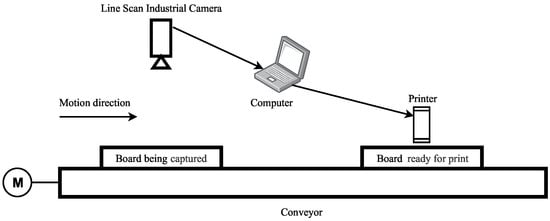 We firstly designed a machine vision testbed to obtain the images of wooden boards. The framework is shown in Figure 1. It is composed of four main parts: a conveyor, a line scan industrial camera, a computer, and a printer. The wooden boards are automatically moved to the image capture area by a conveyor. The frames with pixels captured by the camera are continuously combined to obtain a whole image. With the support of the Industrial Internet of Things [20,21], the images are transmitted to the computer for color classification. After the image is classified, the computer outputs a label of this wooden board to the printer. Then, the printer prints the label on the surface of the wooden board.