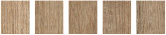 Quantitative color analysis is used to classify the colors of wood. In [2], the author evaluated walnut wood color using the international CIE (Commission International de l’Eclairage) method and found that luminosity can be used to discriminate color in walnut wood. In [3], the surface color region of seven wood species was determined by the analysis of RGB color components, and a specific color of each wood species was used to identify wood species present in a chip mixture. In [7], the authors found that the three parameters (L*, a*, and b*) are adequate for the classification of thermally-modified ash and beech hardwood according to the analysis of the wood color with the CIE L*a*b* color space (L* for the lightness from black to white, a* from green to red, and b* from blue to yellow). In [8], the authors used the CIE L*a*b* system to discriminate the variability of the wood color and determined the correlation with the wood’s basic density for ten Amazonian tree species.