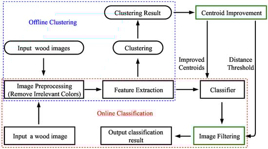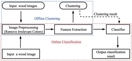 The framework of the proposed mechanism consists of image preprocessing, feature extraction, offline clustering, and online classification, as shown in Figure 5. The wood images are firstly processed based on the color ranges in the HSV color space to remove irrelevant colors in the image. Then, the feature vector is extracted from the preprocessed wood image in the RGB color space. In the offline clustering, the feature vector sets extracted from the preprocessed wood images are partitioned into different clusters based on the K-means algorithm. The clustering result can be used in the online classification to classify the new wood image. The details are given as follows.