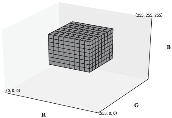After getting the wood color subspace, we divide the color range into the same number of bins in each dimension. With different numbers of bins in each dimension, the wood color subspace would be partitioned into different numbers of cells. For example, if the number of bins in each dimension is eight, the wood color subspace would consist of cells, as shown in Figure 6. For the features extracted from the wood image, the proportions of the number of pixels in each cell to the total number of pixels in the wood color subspace are calculated to represent wood color characteristics. Therefore, the dimension of the extracted feature vector is the third power of the number of bins.