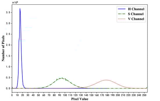 We firstly evaluate the intervals to describe the wood color distribution in the HSV and RGB color space. Based on the 15,000 obtained wood images, Figure 8 shows the numbers of pixels with each value in the H, S, and V channels, respectively. We calculate the confidence intervals for pixel values at a confidence level, which are [9, 22] in the H channel, [59, 131] in the S channel, and [134, 219] in the V channel, respectively. According to these intervals, any irrelevant color whose pixel values are not in these intervals can be removed in the process of image preprocessing.