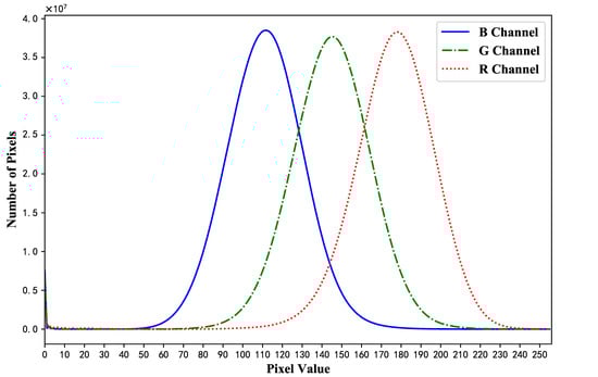 In the RGB color space, the numbers of pixels with each value in the R, G, and B channel are calculated, respectively, as shown in Figure 9. Similarly, the confidence intervals at a confidence level for pixel values in the three channels are calculated, which are [134, 218], [105, 185], and [73, 149], respectively. These intervals are used to construct the wood color subspace, in which the features of the wood color are extracted. It is important to note that the wood color subspace is only of the whole RGB color space. Thus, the extracted features can represent wood colors more accurately.