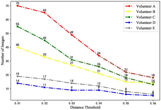 Finally, we study the number of images that are filtered by volunteers and the image filtering algorithm simultaneously. The results are given in Figure 10. It is clear to see that the number of images increases with the reduction of the distance threshold. This result proves the effectiveness of the image filtering algorithm. Nevertheless, some images with short distances to their centroids are filtered by volunteers. We will study this problem in future works.