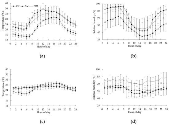 Outdoor and indoor diurnal temperature and RH profiles in CC, AV, and NM houses. (a) Outdoor temperature; (b) Outdoor RH; (c) Indoor temperature; (d) Indoor RH.