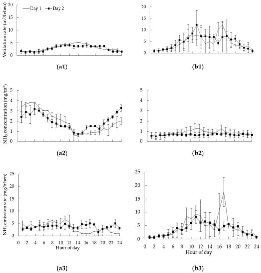 Figure 3(a2,b2) depicted the temporal variations in NH3 concentrations during manure removal (day 1) and the day after manure removal (day 2). On both days, concentrations of NH3 in CC were higher during the night, due to cooler temperature and lower VR, which has been supported by many studies with the same production system [12,18,26]. NH3 concentrations in the CC ranged from 0.63 to 3.79 mg/m3 (2.01 ± 0.93 mg/m3 in average), which were comparable with the average NH3 concentration in similar facilities with the ambient temperature over 25 °C and stock density of 516 cm2/hen in the US midwest (near to 38° N) [27,28].