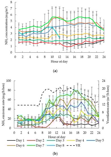 The diurnal average VR in NM ranged from 11.70 to 20.80 m3/h·hen (Figure 4b), which was significantly higher than that in CC and AV (p < 0.05). The daily VR change trend in NM was similar to CC, and the peak of VR occurred from 9:00 to 18:00 because of the high temperature. It was seen that the NH3 concentration gradually increased with the manure accumulation extending (Figure 4a). When the manure was accumulated for 1–3 days, the change in NH3 concentration was contrary to that of VR, and the higher concentrations of NH3 in NM occurred during the night, which was similar to the situation of CC. While it changed reversely from the fourth day, NH3 concentration did not decrease with the increasing VR. In this case, after the manure accumulated on the belt for 4 days, NH3 volatilized from manure with the temperature increasing was more than that exhausted by fans. As shown in Figure 5, the NH3 concentration on day 7 was 3 times higher than that on the second day after manure removal. Mendes et al. [32] reported NH3 concentration at air outlet with manure accumulated for 6 days was about 21 times higher than that for 2 days storage in a laboratory with the hen age of 23 to 36 weeks. Thus, manure accumulation significantly affected NH3 emission rates. It was recommended that the manure should not be stored on the belt for more than 4 days in NM, which was consistent with the findings of Mendes et al. [32]. Otherwise, higher VR was demanded to maintain a good inner environment. NH3 concentrations in NM ranged from 0.93 to 5.65 mg/m3 with an average of 3.06 ± 1.29 mg/m3, which was substantially higher than those in CC and AV (p <0.05) mainly due to much longer manure accumulation time inside the house.