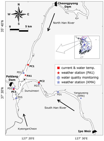 The Han River, South Korea, is located in the central part of the Korean Peninsula within the area range of 36°30′–38°55′ N and 126°24′–129°02′ E. The river basin has an area of 34,674.0 km2, and it accounts for approximately 35% of the nation’s total land area of 99,313.5 km2. The river length is 459.3 km, and the mean basin width is 75.5 km [11]. The Han River ranks as the largest river in South Korea. The Paldang Reservoir in the Han River system plays a vital role as a primary water supply source, and this river-type lake is characterized by a short mean annual residence time of 11.5 days (2014), which means that rainfall and water pollutants flowing into the basin can readily affect the water quality [11]. Furthermore, the influent water in the upper reaches of the Paldang Reservoir, including at upstream dams and weirs, undergoes three-dimensional mixing based on the topographic features of the lake. The Paldang Reservoir is a water body where the hydraulic and water quality characteristics vary spatially and temporally depending on the variations in inflow rates and the physicochemical properties of influent water. In this study, field surveys and analyses were conducted on the Paldang Reservoir where the South Han River and the North Han River meet at Dumulmeori and are joined by another river, the KyeonganCheon, before reaching the PDD (Figure 1).