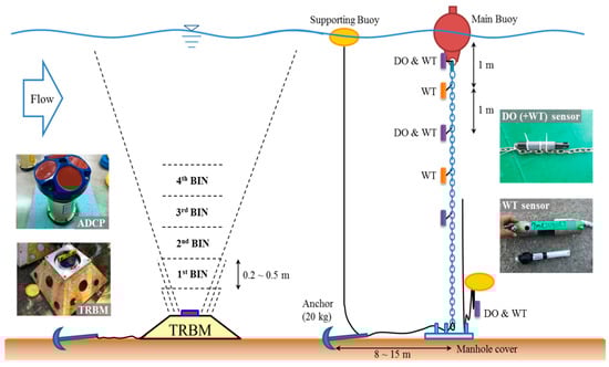 For the continuous depth-specific hydraulic surveys, the ADCP (Model WH-600, RD Instruments) was deployed to measure the flow velocity and direction. The measurements were performed at a time interval of 10 min, and the lateral spacing of the ADCP measurements was set to 0.2–0.5 m, thus allowing for a blank range of less than 1 m above the riverbed (Figure 2). The upper 20% and 50% and the lower 20% in terms of depth were defined as the surface, middle, and lower layers, respectively. The flow velocity and direction information was extracted from the raw measurement data, and during this extraction, the outliers were removed and data were calibrated to true north. The flow velocity variation and the average flow of the Paldang Reservoir were determined by examining the time-series of flow velocity and direction, flow velocity rose diagrams, vertical distributions of residual current, and velocity vector diagrams at individual stations. The bottom sediment at survey sites was examined for granularity to ensure the stable installation of the measuring instruments, and the potential risk of sinking was also investigated for the measuring instruments. By attachment to a trawl-resistant bottom mount (TRBM), ADCPs were moored on the bottom surface in such a way as to avoid the loss of a device caused by fishery activities and vessel traffic and to ensure the stability of the data collection. The TRBM was fastened to the bottom surface by an anchor to prevent the measuring instruments from being swept away by high-velocity flow.