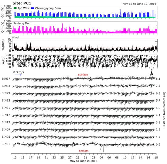Discharge of the Ipo Weir (IPW), the Cheongpyeong Dam (CPD), and the Paldang Dam (PDD); wind speed and wind direction at PA1; and velocity by depth at PC1 from 12 May to 17 June 2016.