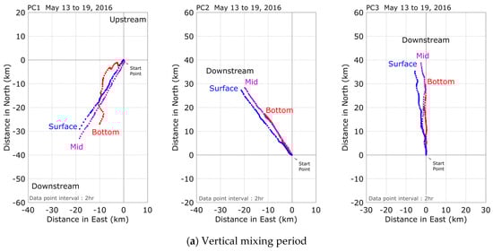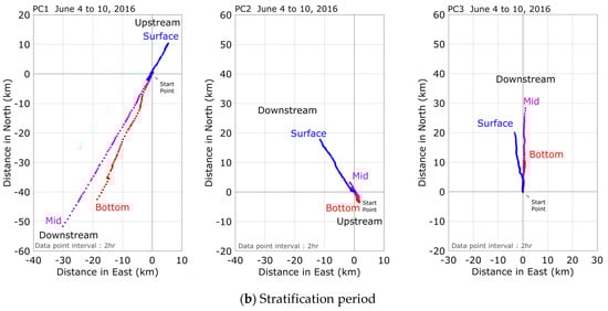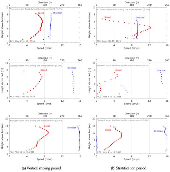 At each station, distinct vertical distributions of residual current were observed for each layer during the stratification period (Figure 4b and Figure 5b). In the surface layer at PC1, upstream flow with 64.8% prevailed over downstream flow, but different from the pattern observed in the surface layer, downstream flow with 93.2% prevailed over upstream flow in the lower layer. Upstream and downstream flows were observed in the upper and lower areas, respectively, around the point 3 m below the water surface. The average flow velocity was close to 0 at a depth of 3 m below water surface, and it increased closer to the water surface. In contrast, below the 3 m point, the average flow velocity increased until near the point 6 m below water surface, and then it decreased until the bottom surface was reached. At PC2, downstream flow with 89.6% prevailed over upstream flow in the surface layer, whereas upstream flow with 60.2% prevailed over downstream flow in the lower layer. Furthermore, similar to PC1, two-layer flow occurred, but in the reversed direction; upstream flow was observed until near the point 4 m above the bottom surface, and downstream flow was observed above the 4 m point. At PC3, similar to the vertical mixing period, downstream flow was observed in all layers.
