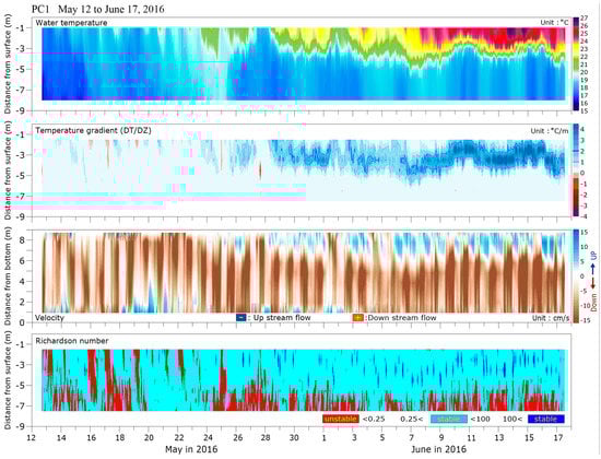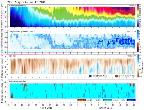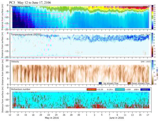 At PC3, the vertical water temperature gradient was small until around 19 May and increased afterwards. Flow velocity intensified in all layers due to dam discharges during the vertical mixing period, and the velocity decreased at times to less than 0.02 m/s in the lower layer, depending on water discharge from the PDD, during the stratification period. The Richardson number was stable in the surface and middle layers during most of the observation periods, but it was mostly unstable in the lower layer. The stratification coefficient log (PEA) remained above 1 J/m3 during the entire observation period. The coefficient gradually increased from the initial stage of observations until 2 June and remained constant at 3 J/m3 afterwards.