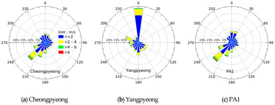 In this study, local meteorological observations were performed to investigate the time series of 1-h average variations in wind velocity, wind direction, temperature, humidity, pressure, and rainfall amount. Wind roses were used to classify the wind direction and velocity data into 16 compass points at 2 m/s intervals, and these results are shown in Figure 9. In general, the meteorological conditions in reservoirs are the major contributors to energy transfers such as heat exchange occurring on the water surface due to solar radiation, sensible heat transfer and evaporation, and wind-induced heat transfer [3]. The comparison of the meteorological observations for wind velocity, wind direction, temperature, humidity, pressure, and rainfall amount produced the following results. Day–night periodic variations were observed in the wind velocity, wind direction, temperature, and humidity. With regard to wind, except for the periods of sporadic wind invasion, southwesterly winds were observed in the daytime, and north–northeasterly winds were observed in the nighttime. The wind velocities gradually increased until noon and then slowly decreased in most cases. In the initial stage of observations, on May 12, 15, and 16, the daily maximum velocities exceeded 10 m/s and the average daily wind velocities exceeded 2 m/s. The average temperature increased and the diurnal temperature range decreased with time towards the later stage of observations. The average daily temperatures increased from May 19 onward, where values exceeded 20 °C and remained around 21–24 °C afterwards.