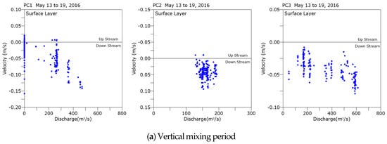 At PC1, a linear relationship between the flow velocity in the downstream direction and the discharge was observed during the vertical mixing period, and a linear relationship between the flow velocity in the downstream direction and the discharge was observed during the stratification period as well. In the surface layer, furthermore, the flow velocity was relatively low compared to that in the middle and lower layers, and flow occurred in the upstream direction during the period of zero discharge from the CPD. At PC2, no significant discharge–velocity relationship was observed, but in the stratification period, flow occurred in the middle and lower layers in the upstream direction during the period of zero discharge from the CPD. At PC3, a linear relationship between the discharge and flow velocity in the downstream direction was observed during the vertical mixing period, and the flow velocity in the lower layer was relatively low compared to that in the surface and middle layers. Moreover, the discharge and flow velocity in the downstream direction had a linear relationship during the stratification period.