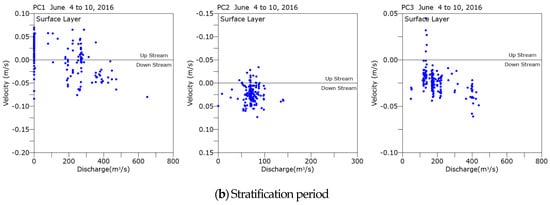 At PC3, which was the location most affected by the discharge pattern of the PDD, downstream flow prevailed, and it exhibited periodicity when the instantaneous discharge rate from the PDD exceeded 400 m3/s. In particular, downstream flow with a velocity greater than 0.2 m/s was observed in all layers when the instantaneous discharge rate of the PDD exceeded 700 m3/s. The flow velocity in the lower layer decreased to below 0.2 m/s, or no flow occurred when the instantaneous discharge rate of the PDD remained below 400 m3/s for several days. To check the flow direction by layer, Figure 4 shows the velocity vectors for the different depth layers and periods. During the vertical mixing period, an average flow in the downstream direction was observed in all layers at all stations (Figure 4a and Figure 5a). At PC1, downstream flow with 86.8% prevailed over upstream flow in the surface layer. Similarly, downstream flow with 81.5%, which was even greater than downstream flow in the surface layer, prevailed over upstream flow in the lower layer at PC1. The average flow velocity was approximately 0.07 m/s near the point 6 m below the water surface, and it decreased closer to the water or bottom surface. In all layers at PC1, the average flow velocity exceeded 0.04 m/s. In the surface layer at PC2, downstream flow with 97.4% prevailed over upstream flow, and in the lower layer at PC2, downstream flow with 85.5% prevailed over upstream flow. The average flow velocity was approximately 0.07 m/s near the point 3 m below the water surface, and it decreased closer to the water or bottom surface. At PC2, the average flow velocity exceeded 0.03 m/s in all layers. At PC3, the highest average flow velocity, approximately 0.09 m/s, was observed near the point 6 m below the water surface, and it decreased closer to the water or bottom surface. At PC1, upstream and downstream flows occurred alternately in the lower layer during the initial stage of observations. This pattern can be attributed to the differences in water temperature, which were observed at the beginning of observations, between the South Han River (lower temperature) and the North Han River (higher temperature). At PC2 and PC3, in particular, downstream flow was observed in all layers.