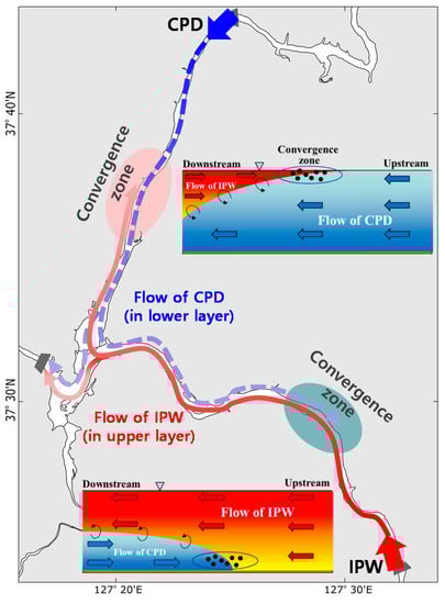 The three-dimensional circulation structure of the Paldang Reservoir is illustrated in the cross-section diagram shown in Figure 11. The surface layer in the middle–lower reaches of the North Han River accommodates the IPW-originated high-temperature water flowing in the upstream direction. Meanwhile, the lower layer contains the CPD-originated low-temperature water, and flow occurs in the downstream direction. Moreover, a convergence zone forms near the middle reaches of the North Han River, which results in the stagnation of water. The vertical mixing of suspended materials hardly takes place on the surface layer in the middle–lower reaches of the North Han River because the surface layer remains mostly stable. The surface layer in the lower reaches of the South Han River accommodates the IPW-originated high-temperature water flowing in the downstream direction. The middle and lower layers contain the CPD-originated low-temperature water flowing in the upstream direction. The low-temperature, formerly-discharged old water from the CPD resides in the lower layer.