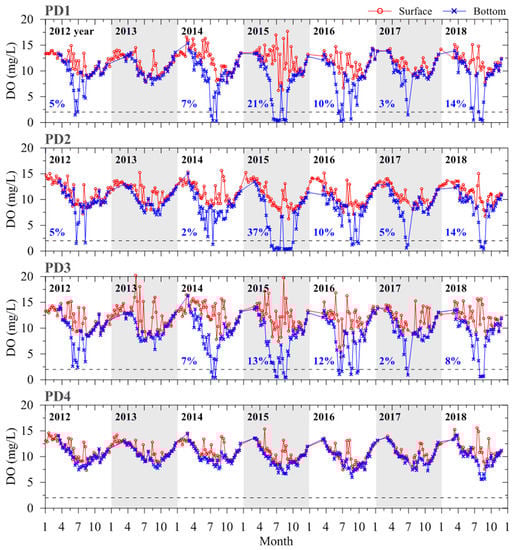 The complex three-dimensional water circulation structure has a major influence on the water quality of the Paldang Reservoir. To verify this, a time series of DO variation and data on the prevalence of annual hypoxia (below 2 mg/L) were collected from key locations in the Paldang Reservoir, such as at Paldangdam Sites 1–4 (PD1–PD4) of the water quality monitoring network of the Ministry of Environment, South Korea, at approximately eight-day intervals from 2012 to 2018. The resulting data are shown in Figure 12. In the North Han River (PD4), no hypoxic conditions (below 2 mg/L) were detected. In contrast, hypoxia was observed in the lower layer of the South Han River (PD1 and PD3) and in front of the Paldangdam (PD2) during summer from June through August, which is when the stratification mostly occurred. The hypoxic conditions prevailed in Paldang Dam 1 Site (PD1), which is located further upstream from Paldangdam 3 Site (PD3). This can be attributed to limited vertical mixing between the surface water with high DO concentrations and the bottom water below the thermocline with a high water mass stability and an increased water residence time caused by upstream flow occurring in the presence of stratification in the lower layer of the South Han River.