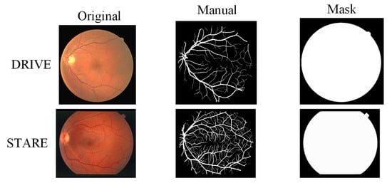 Figure 2 is a data example of the two datasets, and the three columns are original fundus blood vessel image, manual segmentation of blood vessels, and masks. Since the masks are not given by STARE, we manually created masks among them.