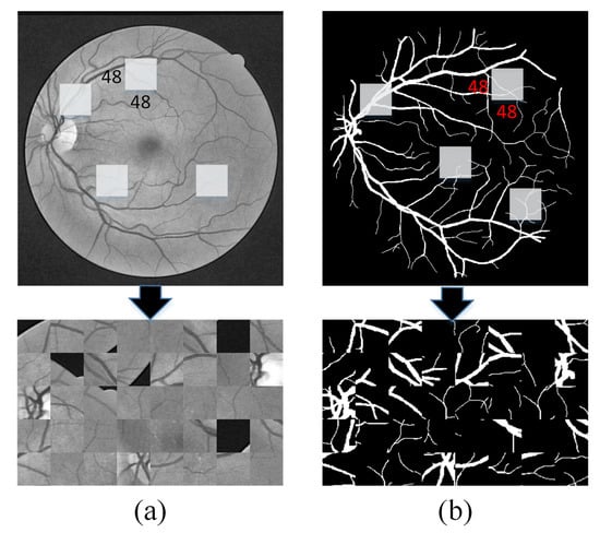 Samples of random segmentation: (a) randomly extract 48 × 48 patch image blocks from the preprocessed image and (b) the corresponding label from the gold standard image.