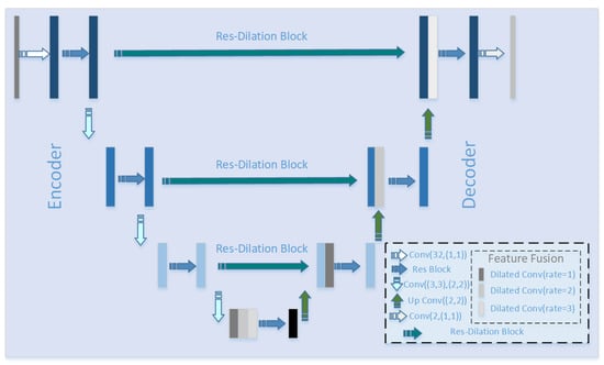 U-Net [] has a good effect in the field of medical image segmentation, and many scholars have made different improvements on the segmentation of U-Net network in medical images. The limitation of U-Net and its variants is that. in order to learn more abstract feature information in an image, continuous convolution and pooling operations will be performed, but resolution of image features will be reduced with the deepening of the network. The intuitive expression is that, as the network level deepens, the detailed information in the image will be seriously lost. Based on this, we designed a new U-Net structure, namely MRU-Net. As showned in Figure 5, the proposed model is mainly composed of three modules: a feature encoder–decoder module, a multi-scale feature fusion module, and a skip connection module.
