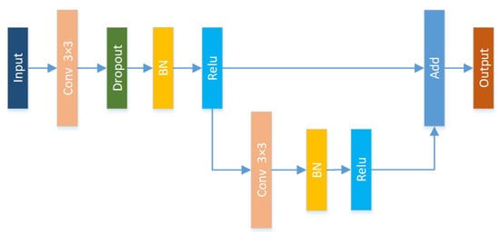 Figure 6 shows the proposed Res-Block structure. Among them, dropout is used to randomly inactivate some neurons to prevent overfitting during model training; Batch Normalization (BN) is used to normalize the activation value of hidden layer neurons, which can prevent the gradient vanishing due to noise in the retina and can improve the expression ability of the model; each convolutional layer in the paper uses linear correction units for feature extraction. Relu can effectively reduce the complexity of the network and increase the convergence rate of the network. Its formula is as follows: