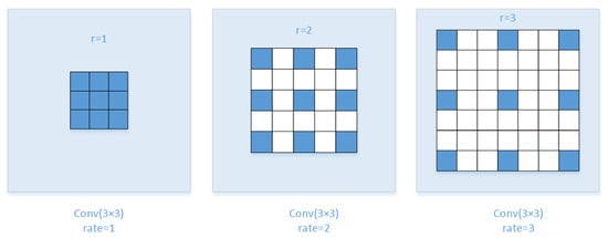 Among them, x is the input feature map, w is the filter, and r is the expansion rate, which determines the stride of sampling the input signal. It is equivalent to convoluting input x with upsampled filters produced by inserting zeros between two consecutive flter values along each spatial dimension. The schematic diagram of the dilated convolution is shown in Figure 7.