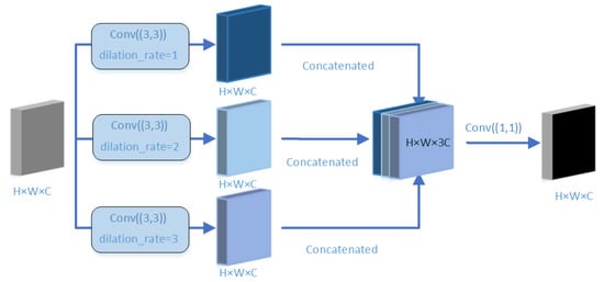 Our proposed multi-scale feature fusion module is shown in Figure 8. Generally, the convolution of a larger receptive domain can extract more abstract features of a large object, while the convolution of a small receptive domain is better for small objects. We use three branches to receive the semantic information in the encoder module. Firstly, the dilated rate in the dilated convolution is set to 1, 2, and 3 to expand the receptive field, thereby extracting feature information of different scales in the encoder module; then, the image semantic features extracted from different dilated rates are combined; and finally, in order to reduce the parameters and computational complexity, the Conv (1 × 1) convolution operation is used to reduce the channel dimension of the feature map to 1/3 of the original dimension.