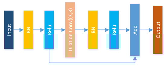 Because the U-Net model is a deep structure, as the depth of the model increases, the extraction of image feature information will become more abstract. Ibtehaz et al. [] have shown that, if skip connection is directly used to merge low-dimensional image information and high-dimensional image information, a semantic gap may be generated due to the large difference between image features, which will affect the segmentation effect. Based on this, in the skip connection, we add the Res-Dilated module that combines the residual network and dilated convolution. On the one hand, the high-dimensional representation information of the image is extracted, and on the other hand, the detailed representation information in the receptive field extraction image is increased. The Res-Dilated structure is shown in Figure 9.